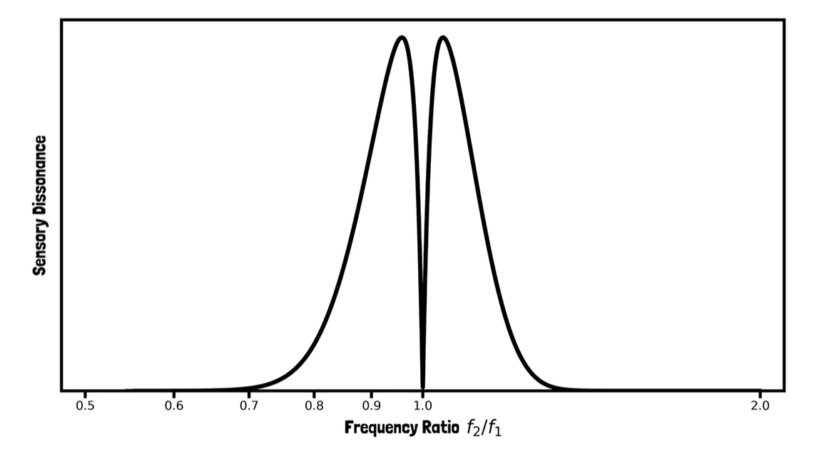 - 两个正弦波频率相同时无不和谐,其中一个不变,一个不断升高过程中,不和谐先急剧上升再逐渐下降,但不会回到0。另一个不断降低同理。即会存在一个相近的不和谐区。