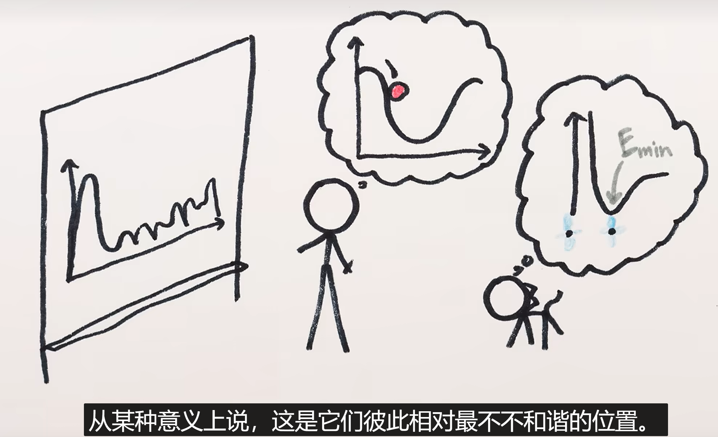 此处联系小球滚落的重力势能、粒子之间的引力斥力等,都存在一个“最低点”,是它们“最不 不和谐”的位置(比如氢原子恰好在那里产生)。