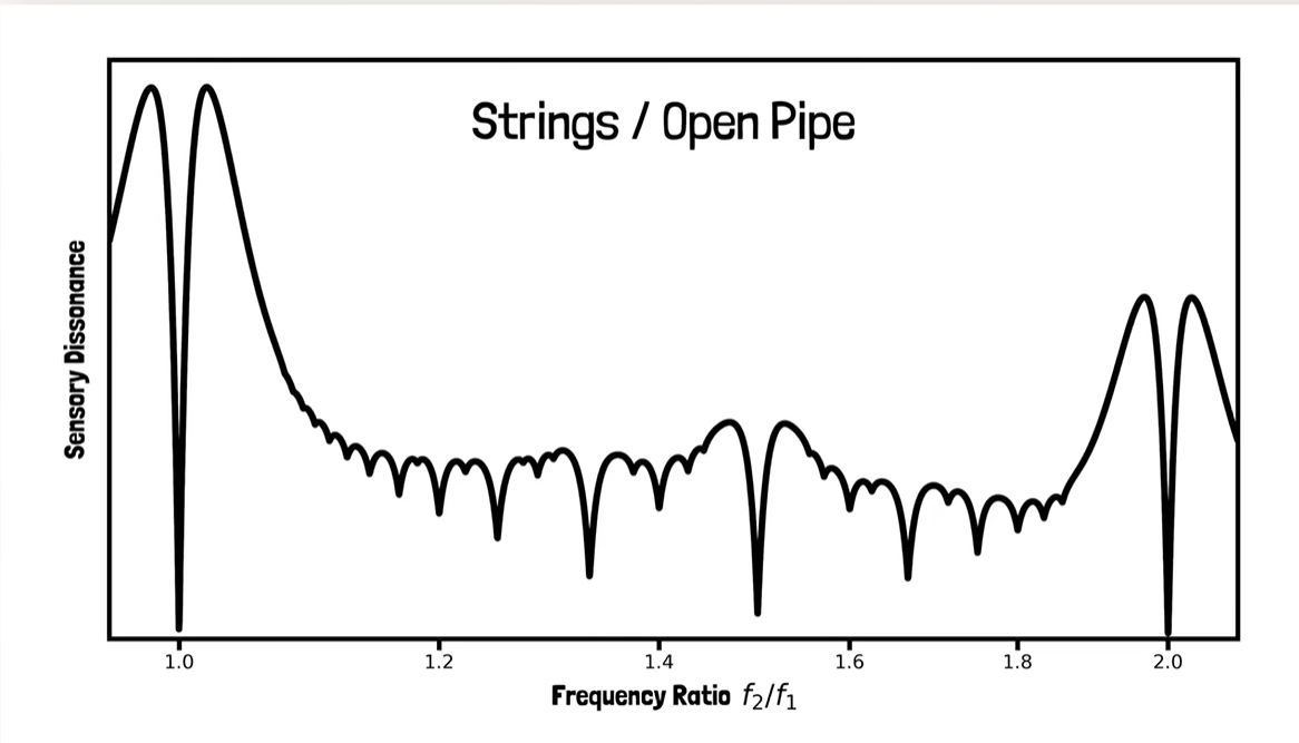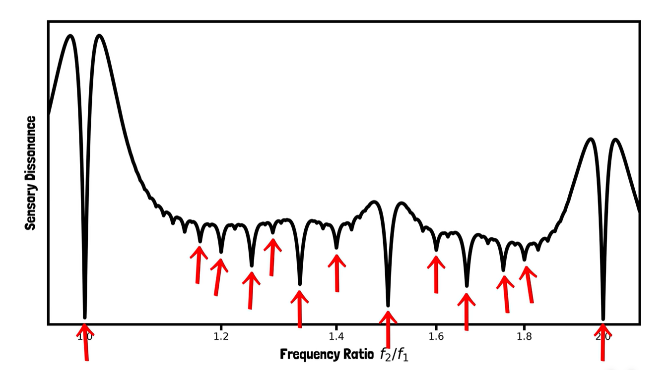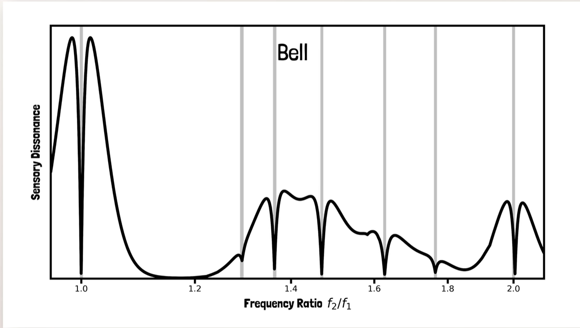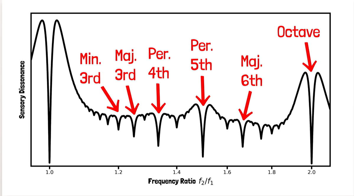 当音符彼此非常接近或非常接近第一个泛音时,会得到很不和谐的峰值。谷底对应两个泛音列排列的足够好的情况,使它们很少有对彼此不和谐。
