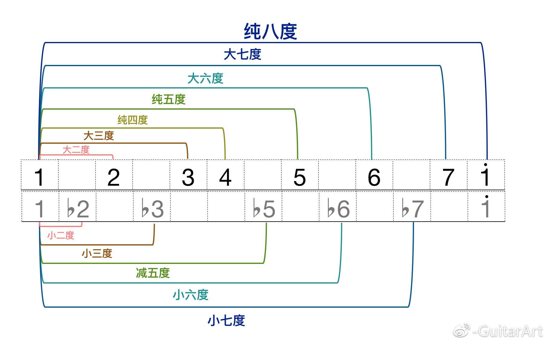 - 两个维度:度数(同度、二度…八度、九度…)看 谱面上的音名 距离(如C-G就是五度);音数(含半音个数)决定 大、小、纯、增、减。同一度数可以对应不同半音数(如大三度 4 半音、小三度 3 半音)。