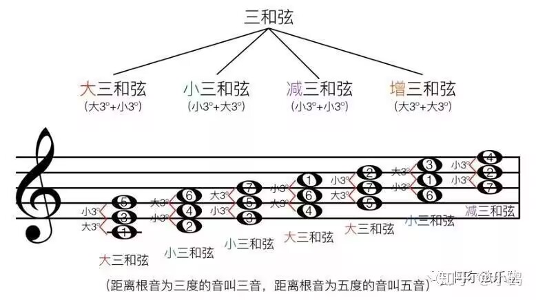 - 减三和弦(Diminished triad):根—三 小三度,根—五 减五度(三—五仍为 小三度)。极不稳定,常向相邻和弦解决;自然大调 vii°(导三和弦)即减三结构。