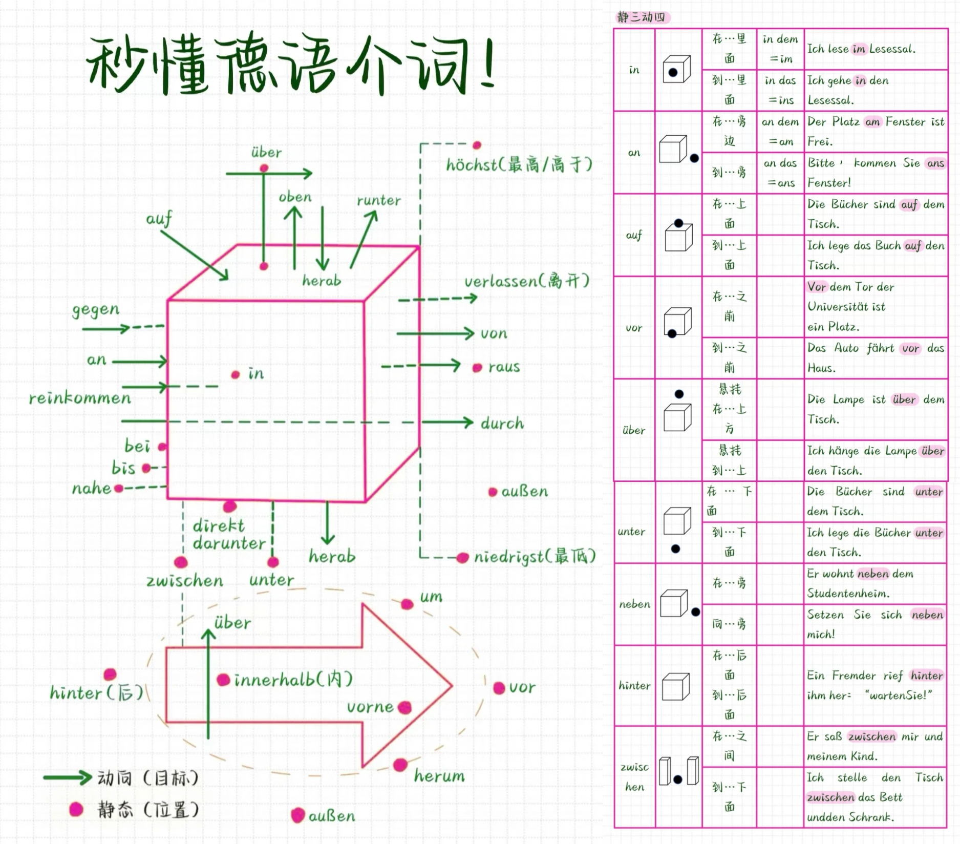 - 第四格做动词宾语或介词宾语(durch, für, gegen, ohne, um, bis及九个方位介词auf, über, vor, hinter, unter, an, neben, in, zwischen支配静三动四)