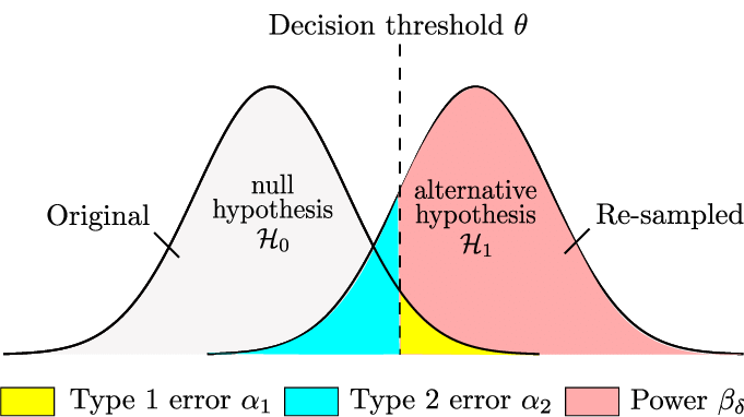 若 $H_0$ 为真,组间波动应当与组内噪声同量级;若 $H_1$ 为真,组间波动会显著变大。
