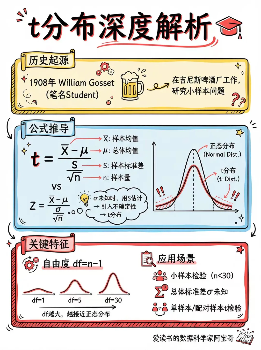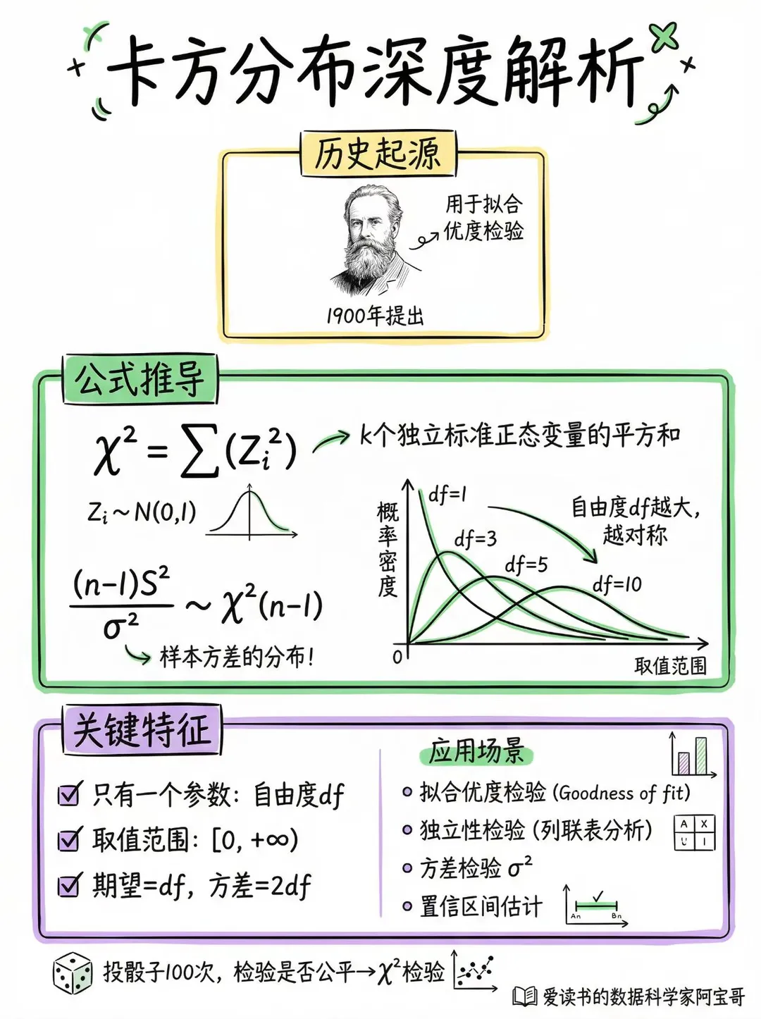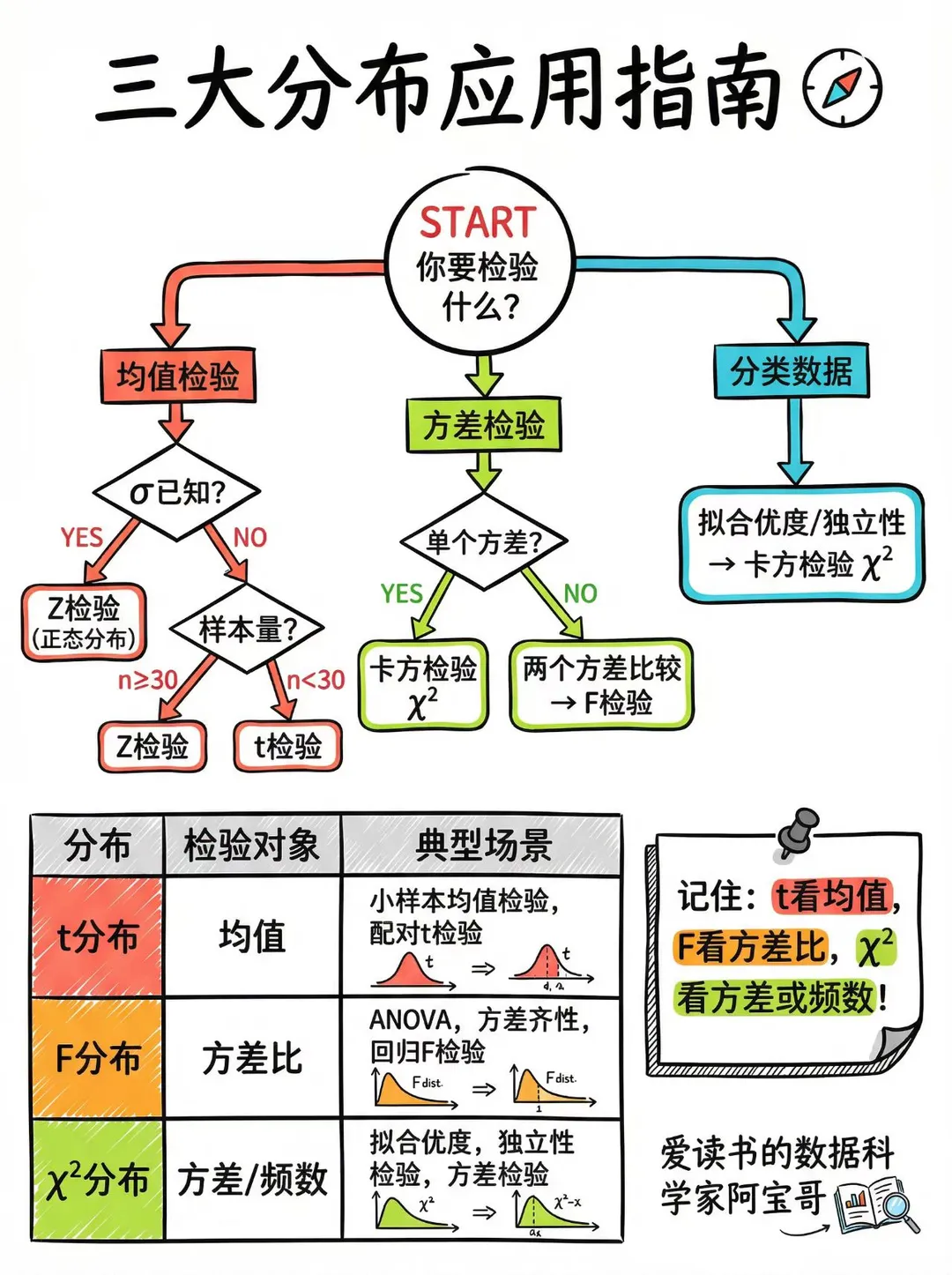 - 标准正态平方和给出 $\chi^2$;正态除以独立的卡方平方根得到 $t$;两个独立卡方的比得到 $F$。