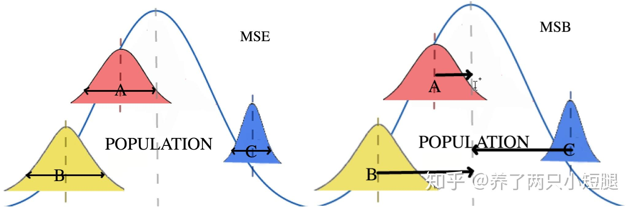 - 算自由度:$\mathrm{df}_B,\mathrm{df}_W$,进而 $\mathrm{MSB}=\mathrm{SSB}/\mathrm{df}_B$,$\mathrm{MSW}=\mathrm{SSW}/\mathrm{df}_W$。