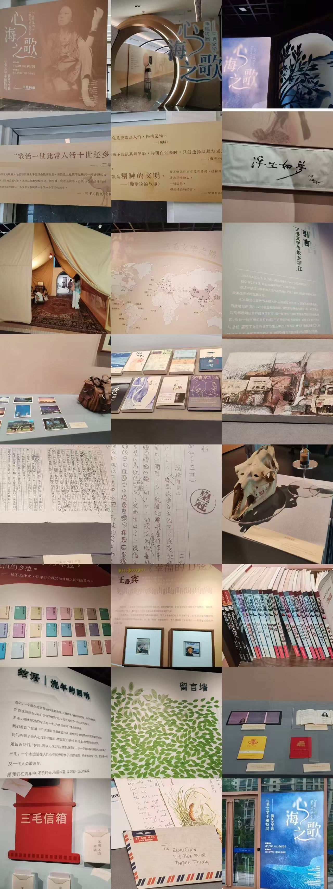 展览内容不多,有四条线:文学线和旅行线,还有影视影响和故乡情缘。读者可以跟着护照、旅游包、褪了色但依旧是彩虹色的照片还有老演员——三毛荷西爱情象征之骆驼头骨,重走三毛的旅途。那个撒哈拉沙漠风格的帐篷里摆满了书, 有读者在其中静静翻阅。结合了那种3D博物馆会有的壁画+半立体浮雕构成场景给人拍照。看到“浮生若梦”的书法就很喜欢三毛的字体,称得上娟秀规整,但笔画间透露出的,是韧劲与自由。手稿一页没有几个字,飘满了修改涂画的符号,可她的字就像她本人一样鲜活明丽,字如其人啊。除了手稿还有很多原版著作,很喜欢老书的装帧设计,也有点后悔没有从家里带一本她的书前来合照,不过仅仅是看着,我也满足了。