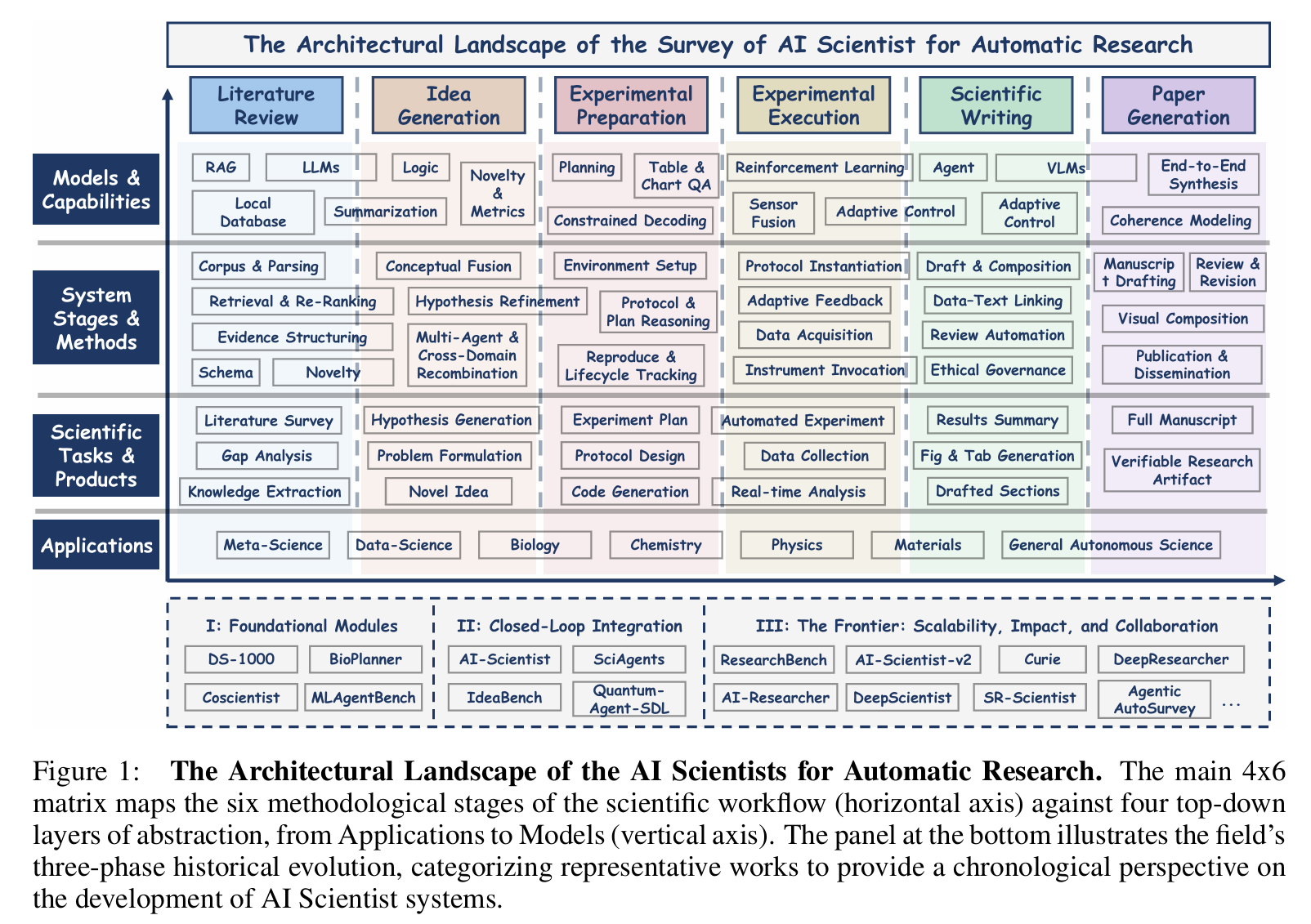 AI Scientist 系统现已能够自主生成假设、设计实验、分析数据并产出论文手稿,覆盖多个科学领域。现有实现可分为两个层级:(1)通用 AI Scientist 系统,追求端到端、跨领域的自主性;(2)领域特定的 AI Scientist 系统,专门针对化学、生物学、物理学和元科学等领域。