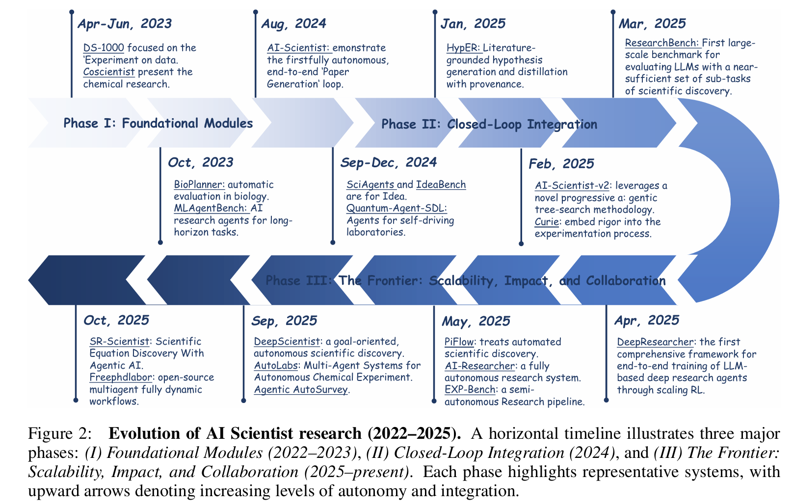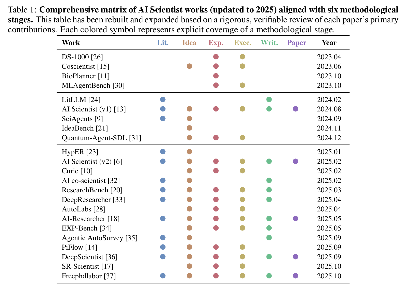 - DeepScientist:完全自主系统,代表最高级的端到端能力