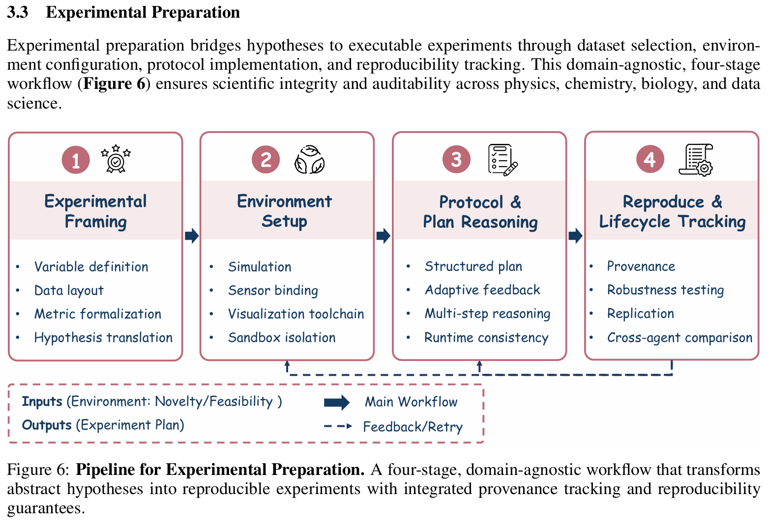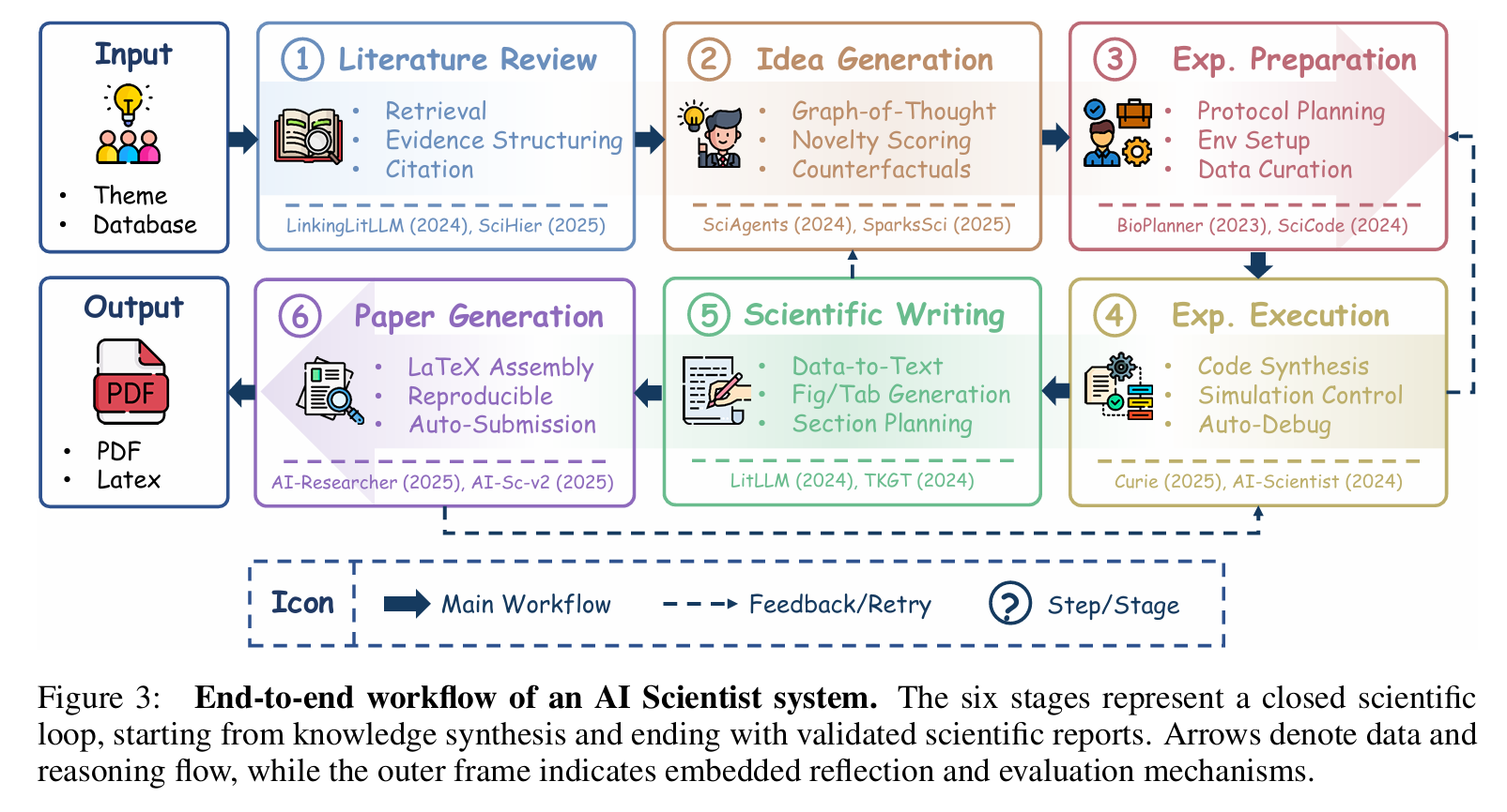 AI Scientist 是一类面向完整科学研究生命周期的自主智能系统,不仅处理数据,还参与知识发现、假设生成、实验设计、结果解释、论文撰写乃至投稿准备等高阶认知活动。其终极目标是实现端到端可验证、可复现、可审计的科研自动化。