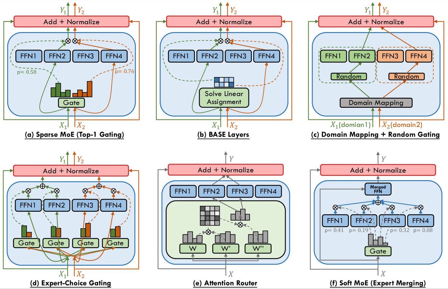 - 推理时,通过”门控机制”(Gating Mechanism)决定每个 token 应该路由到哪个专家